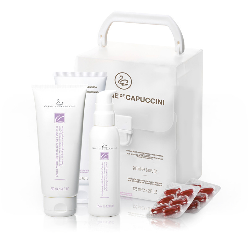 KRÉM MULTIREGENERAČNÍ PROTI ZNÁMKÁM STÁRNUTÍ AGE – DEFENSE (200 ml): - Speciální přípravek pro masáž. - Obsahuje esenciální mastné kyseliny a isoflavony, které vyživují, regenerují a obnovují hustotu kožních tkání.